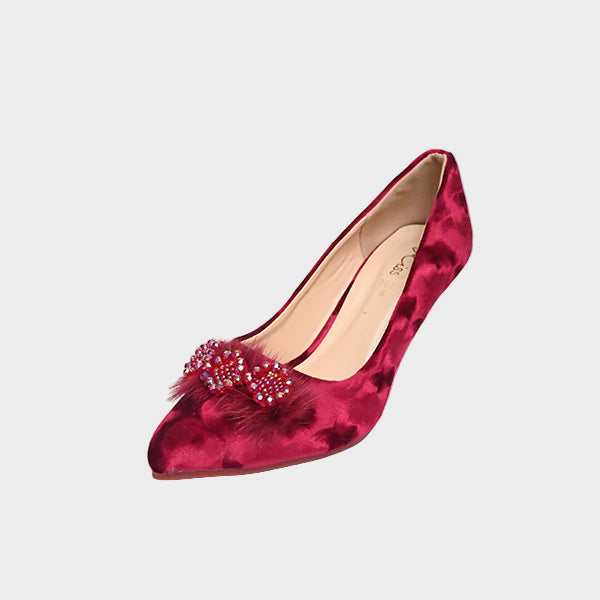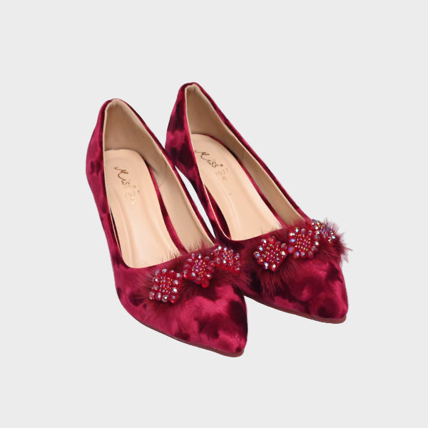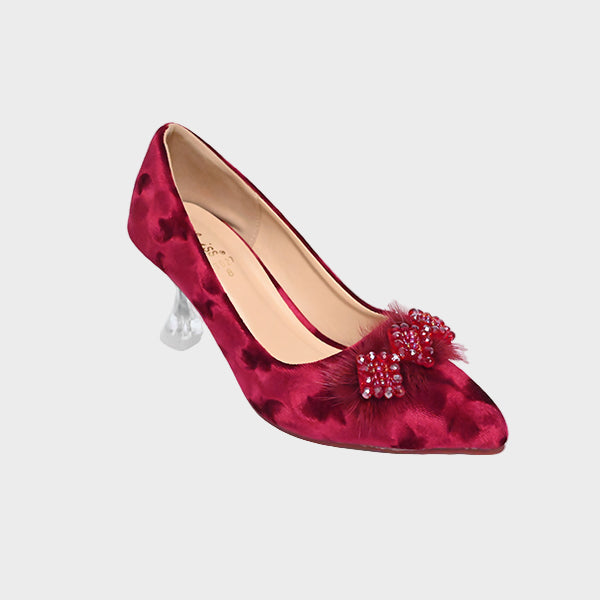 Make a stunning style statement with these luxurious maroon court heels, crafted for women who love glamorous details and rich, standout colors. The soft patterned finish adds texture and depth, while the dual embellished bows—featuring beads, crystals, and fluffy accents—bring a touch of festive charm. A transparent block heel completes the look, giving it a modern, stylish edge without compromising on comfort.